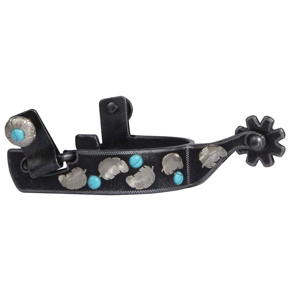 These knockout spurs from Professional’s Choice feature a beautiful silver engraved feather design with turquoise accents. 3/4 inch band and 8 point rowel.