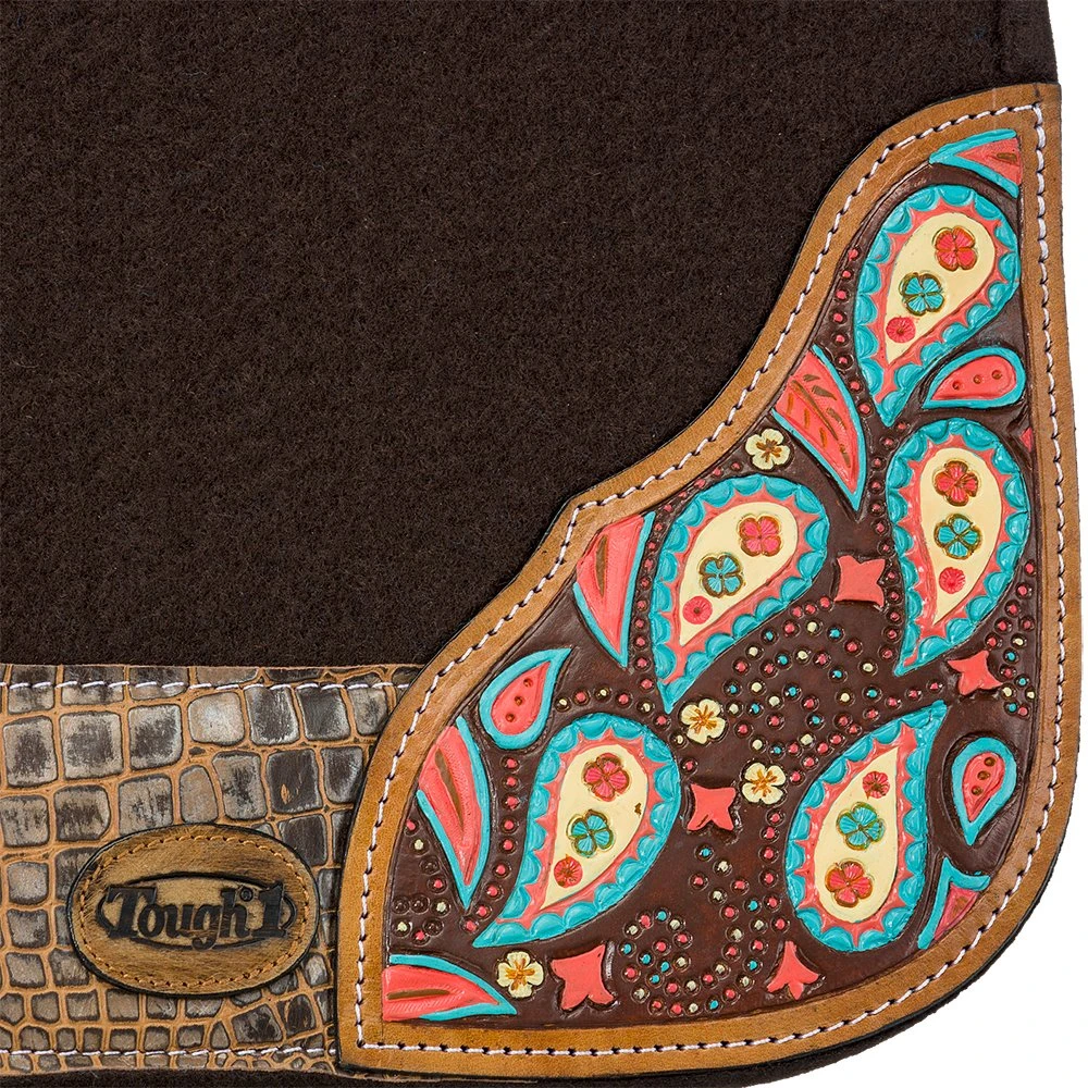 Rich brown felt is accented with brown faux croc wear leathers and hand tooled paisley design on leather corners and wither. Colorful hand painting brings the paisley design to life. 31” x 32”